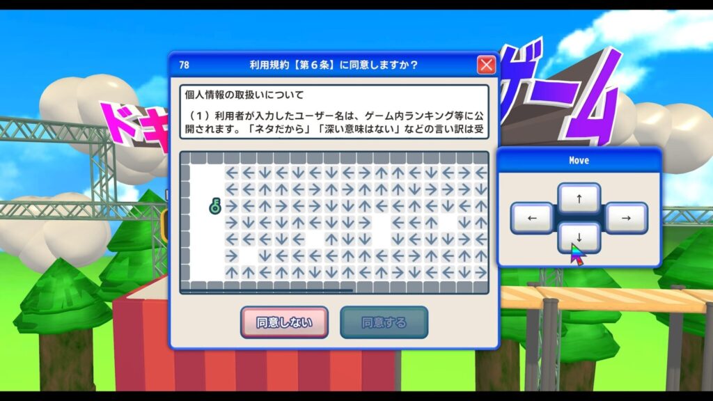 本作の目的は極めてシンプル。横スクロールアクションゲーム「ドキドキアクションゲーム」をプレイするために、全12項目の利用規約に同意する——ただそれだけだ。
