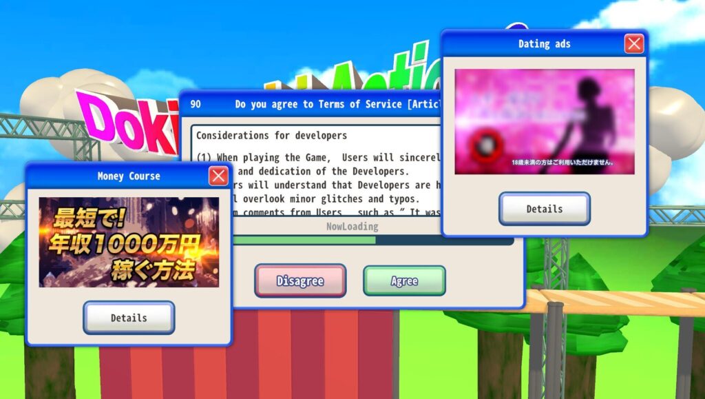 実際にプレイしてみると、その「趣向」の幅広さに驚かされる。「同意する」ボタンが逃げ回る、複数のウィンドウが次々と開いて邪魔をする、突然ブロック崩しが始まる、クレーンゲームで「同意」ボタンを掴まなければならない——100種類を超える多彩な利用規約画面が用意されており、その全てがプレイヤーの同意を阻もうとしてくる。