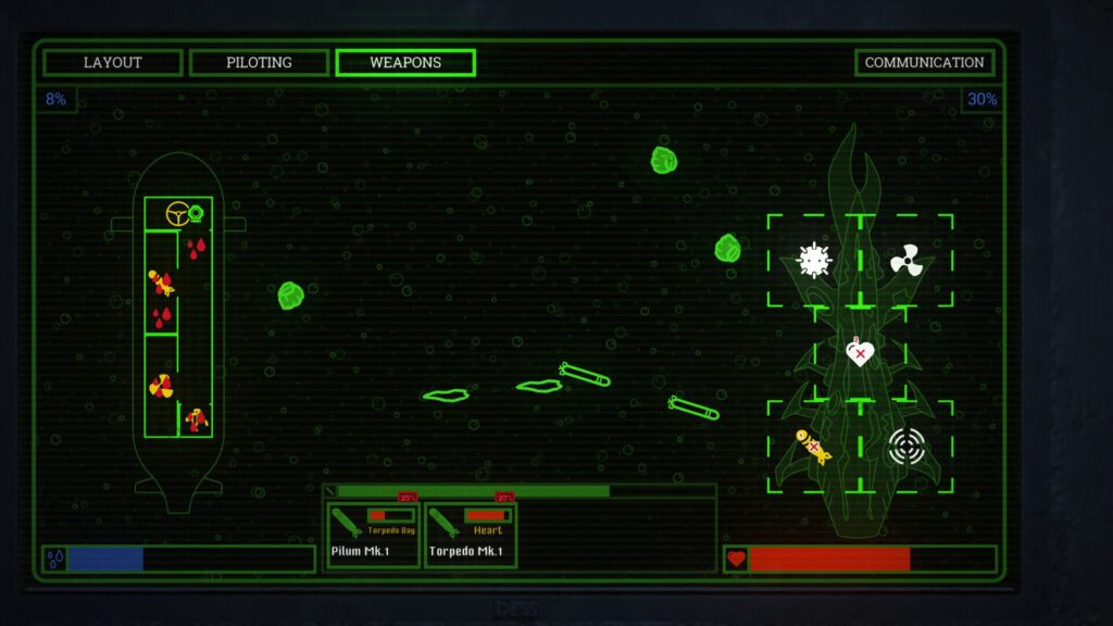 潜水艦は完全にカスタマイズ可能で、新しい部屋を追加したり、配置を変更したり、武器システムをアップグレードしたりできる。魚雷、ハープーン、機雷など、多様な武装を駆使して敵艦と戦うことになる。特に魚雷を使った戦闘は緊迫感があり、照準を合わせながら装填速度を上げるために魚雷発射管の前で待機するという、まさに「人力」な作業が求められる。