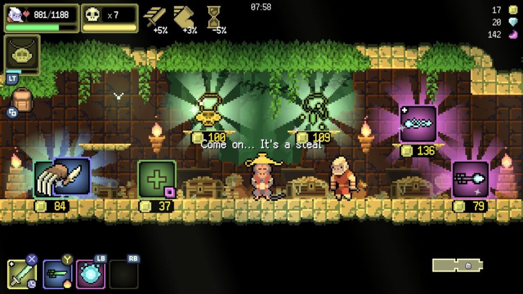 ローグライクの生命線とも言える死亡時のロスト要素が、本作では絶妙にバランス調整されている。死ぬと確かに装備やレベルは失うが、獲得した経験値とお金の一部は持ち帰れる。そして何より、解放した武器や魔法、救出したキャラクターは永続的に残る。