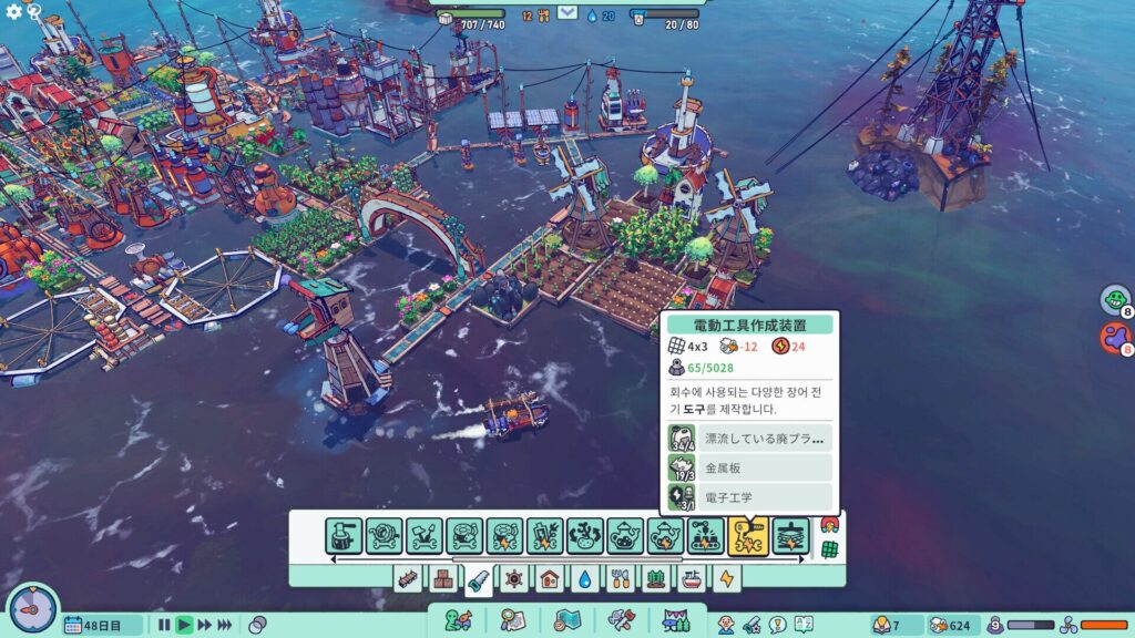 最初は小さな筏のような拠点から始まるが、板を継ぎ足し、建物を増築していくうちに、次第にカラフルなパッチワーク都市へと変貌を遂げる光景は圧巻だ。「ゴミを資源に変える」というコンセプトが単なる設定ではなく、実際のゲームシステムと完璧に噛み合っているのが素晴らしい。