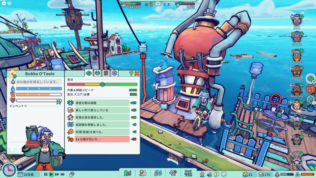 見た目のかわいらしさに騙されてはいけない。『Flotsam』のサバイバル要素は想像以上にシビアだ。清潔な飲み水の確保、栄養のある食料の生産、汚染や病気の管理など、気を抜けばあっという間に住民たちの生活が破綻してしまう。