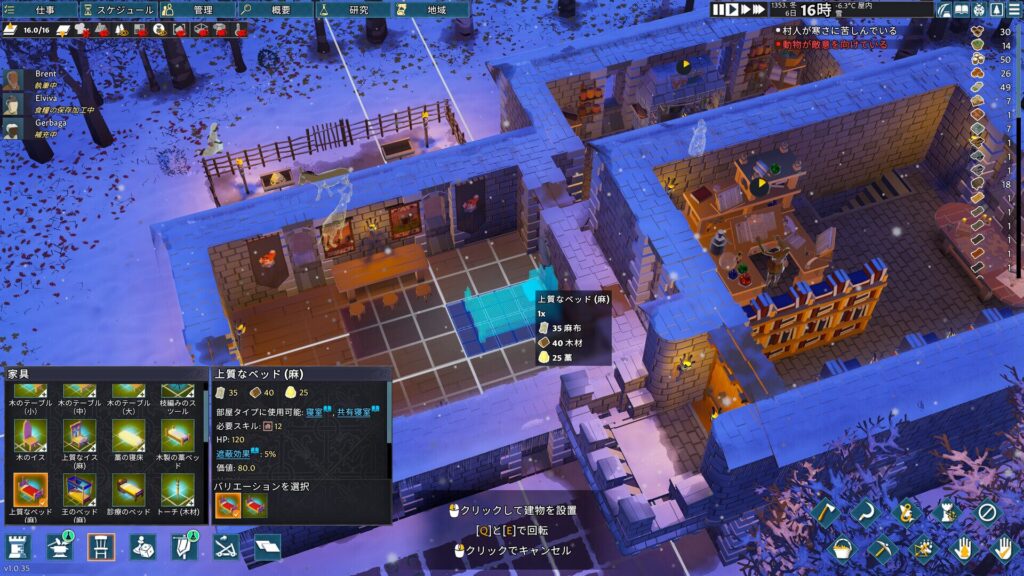 春と夏のうちに食料を蓄え、冬に備えなければ開拓者たちは飢える。キャベツを栽培し、キャベツスープに加工する。狩猟で手に入れた肉を燻製にし、長期保存する。地下の冷涼な貯蔵庫に食料を収め、暖房用の薪を確保する──こうした準備を怠れば、一瞬で集落は崩壊する。
