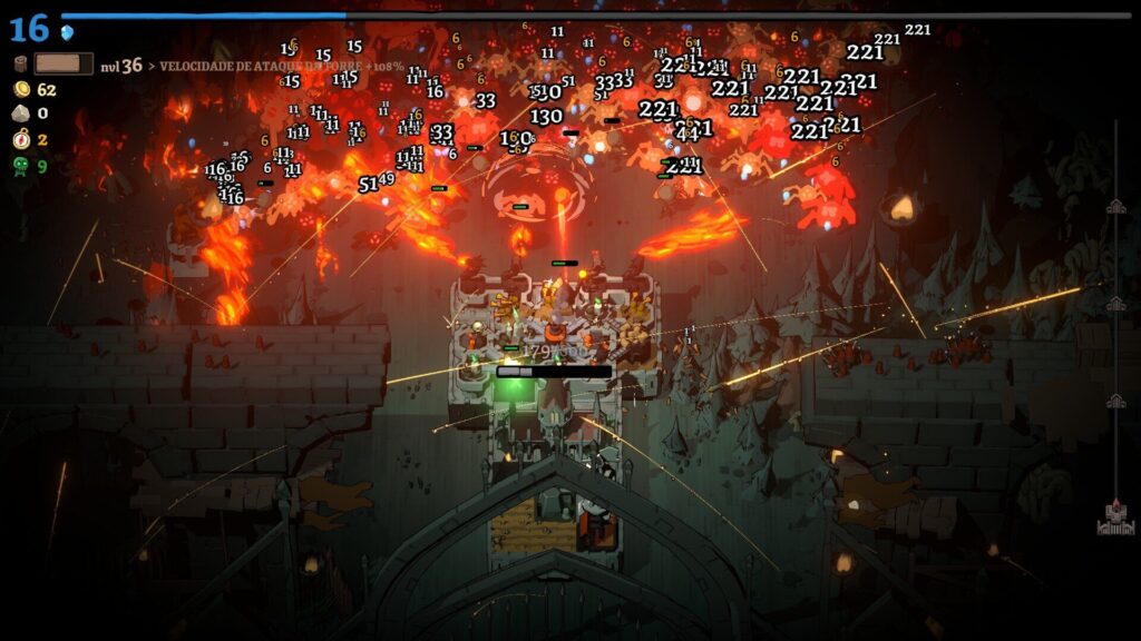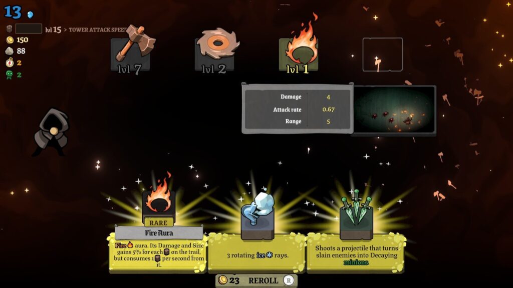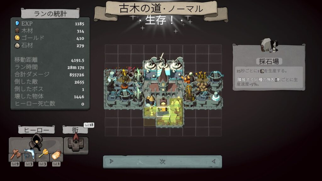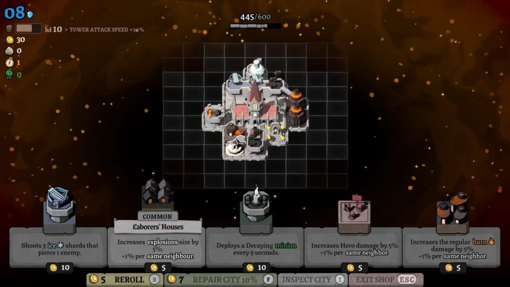 レベルアップすると、街に新しい建物を配置できる。弓兵の見張り台、死霊術師の塔、火を吹くドラゴン、ファームランド、石切り場……。選択肢はランダムに3つ提示され、そこから1つを選んで街のグリッドに配置する。