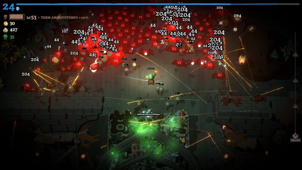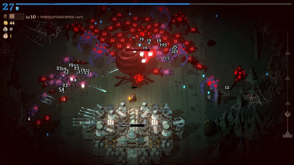 さらに、ランを終えるごとに「コンパス」という通貨が手に入り、永続的なアップグレードを購入できる。タワーのダメージアップ、攻撃速度アップ、資源収集速度アップ……。