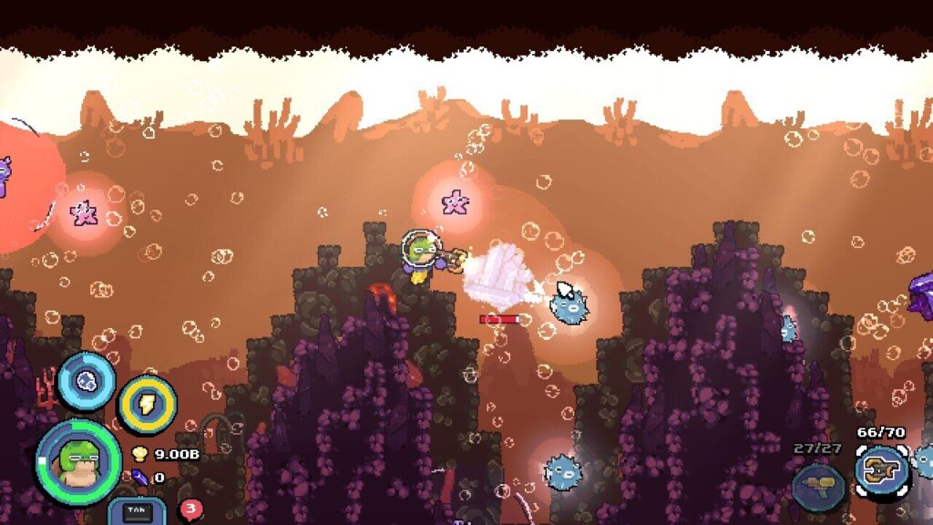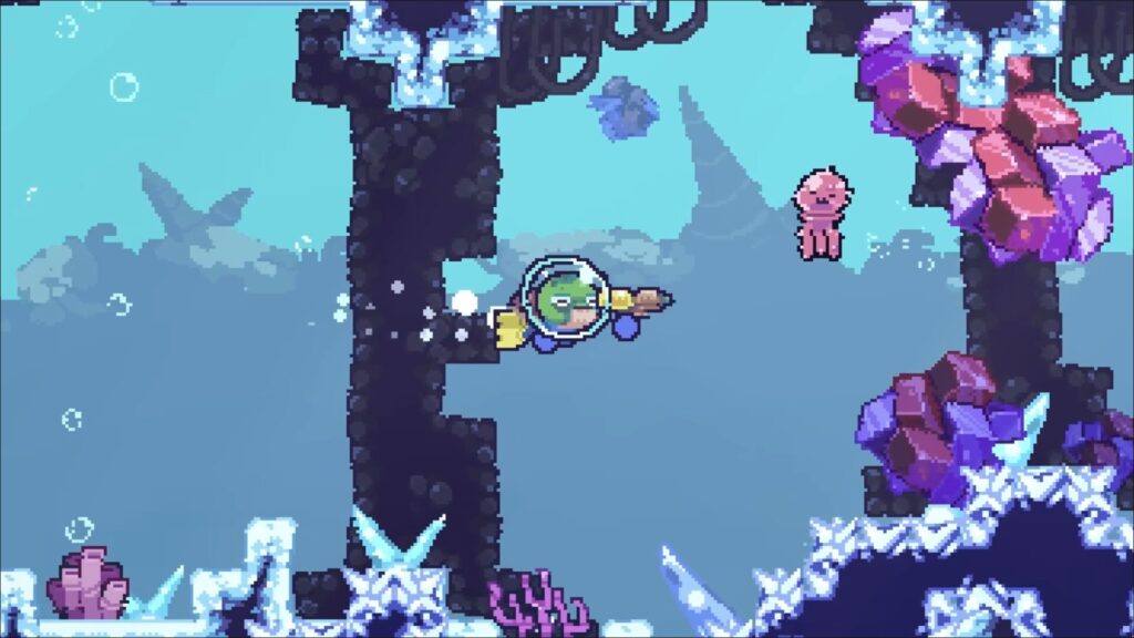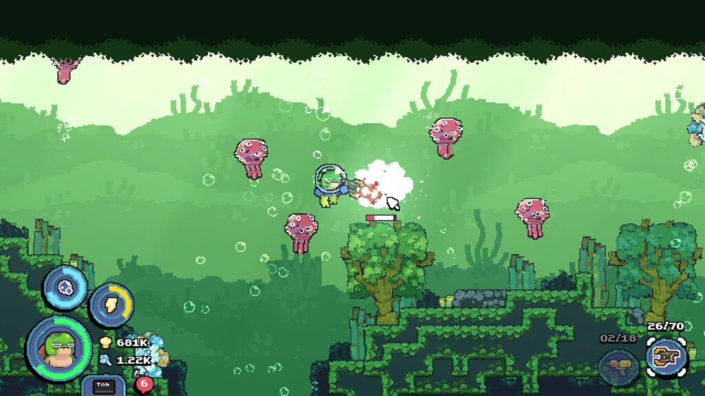 『Shelldiver』のビジュアルは、一見するとシンプルなドット絵だ。しかし、よく見るとクラゲの一匹一匹が丁寧にアニメーションしており、海底の岩や海藻も細やかに描き込まれている。色数を抑えたピクセルアートは、どこか懐かしさを感じさせながらも、現代的な洗練されたセンスを感じる。