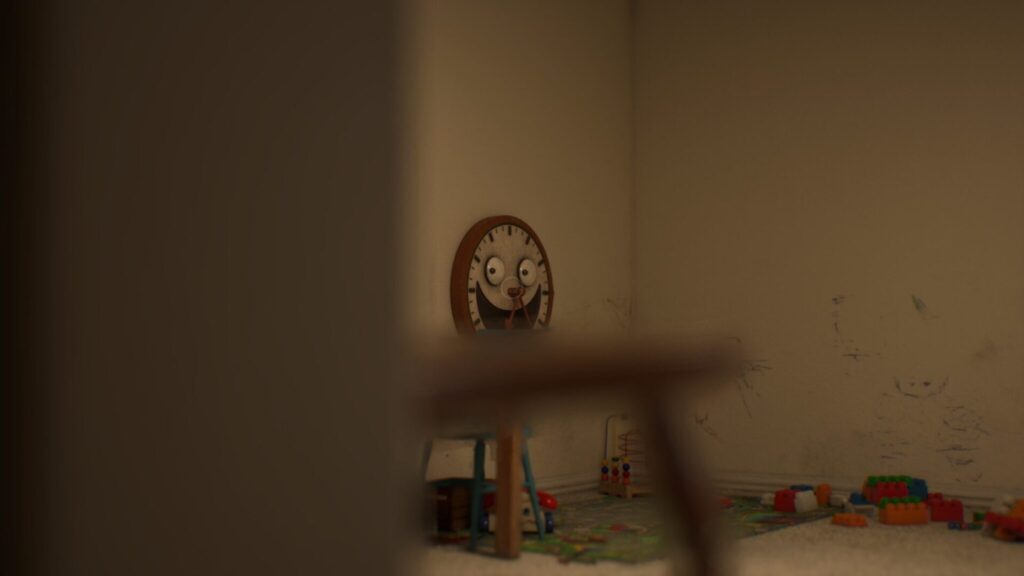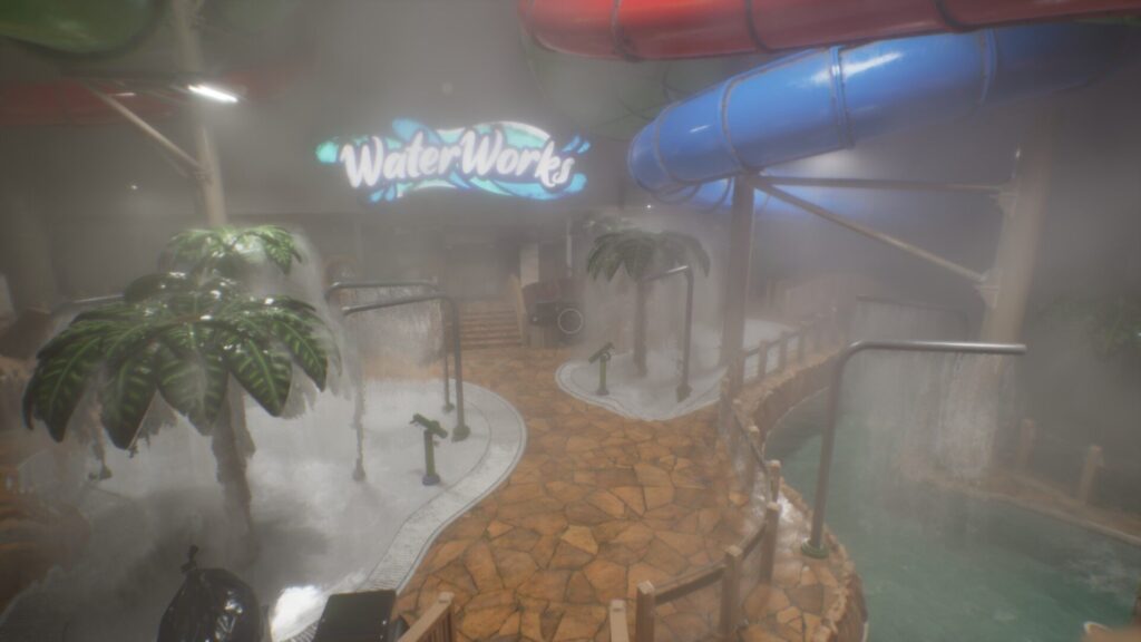 プレイヤーが操作する主人公・ケイレブは、自分自身の潜在意識の中に閉じ込められている。地下室、ウォーターパーク、プレイプレイス(子供の遊び場)、バウンスハウス……それぞれの場所は、彼の幼少期の記憶の断片だ。しかし、そこは決して温かい思い出の場所ではない。誰もいないウォータースライド、暗闇に響く子供の笑い声、どこまでも続く同じ廊下。Unreal Engine 5のLumenライティングとNaniteジオメトリ技術によって、極めて写実的に描かれた空間は、それゆえに不気味さを増している。