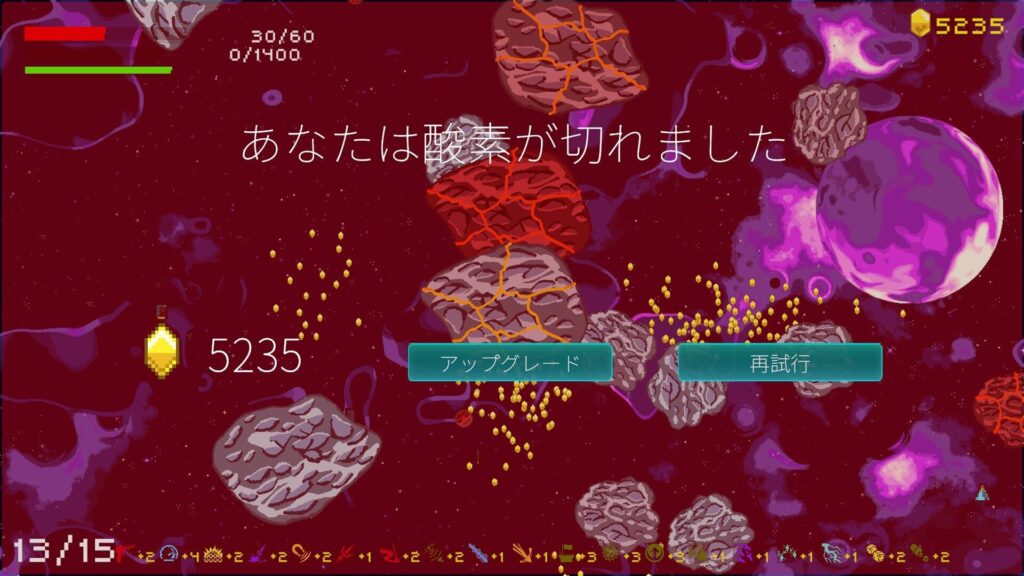 「これ、本当にクリアできるの?」と不安になったが、ここで重要なのが「酸素」のアップグレード。レビューでも指摘されている通り、序盤は何よりも酸素を優先的に上げるべきだ。