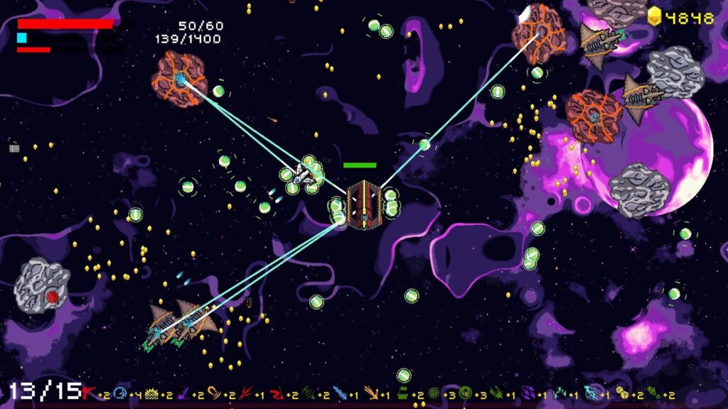 このマザーシップの存在が、本作の戦略性を大きく広げている。自分は敵船を狙いながら、マザーシップには小惑星を任せる。あるいはその逆。状況に応じて役割分担を変えることで、より効率的に敵を殲滅できるようになる。